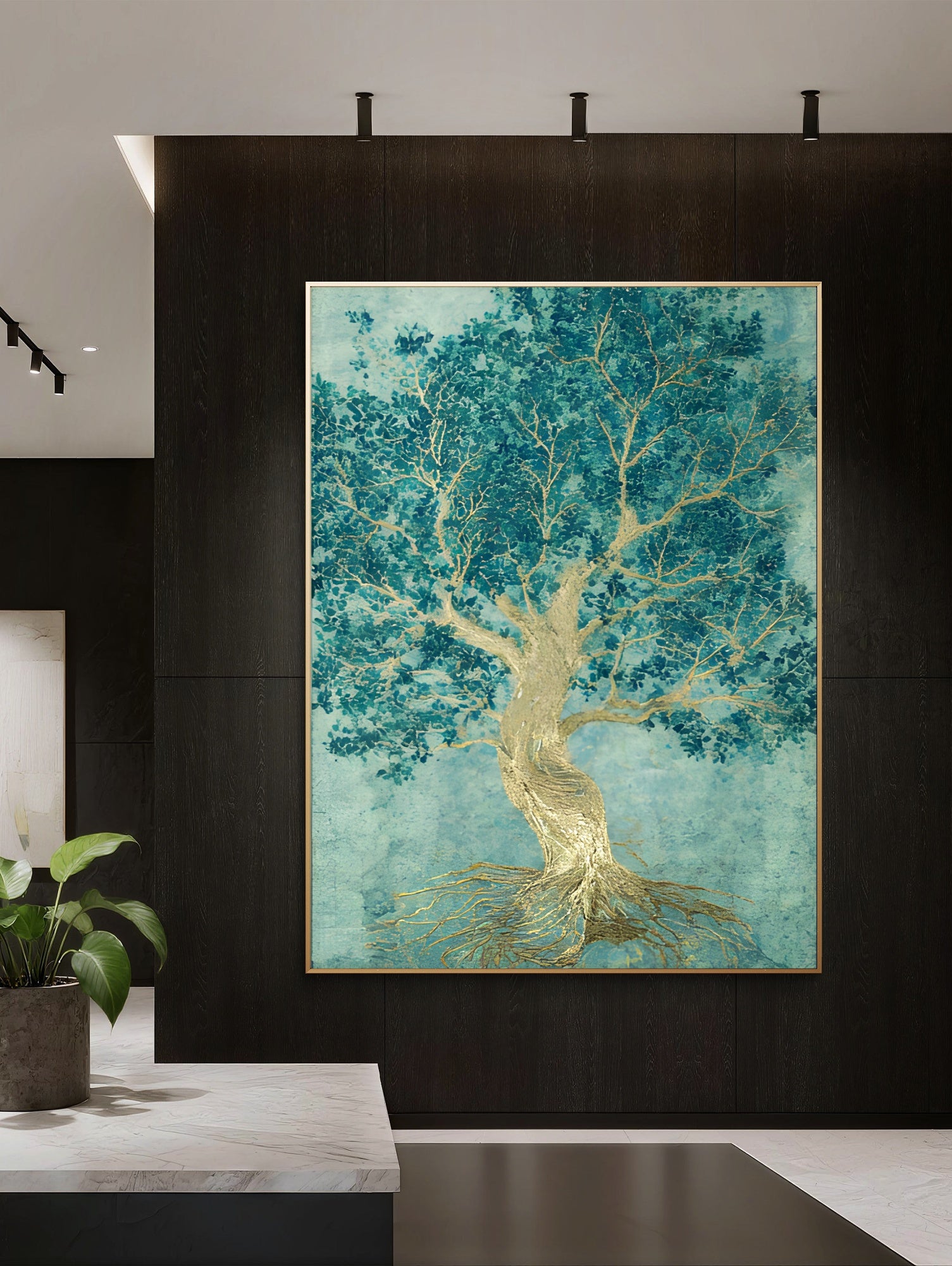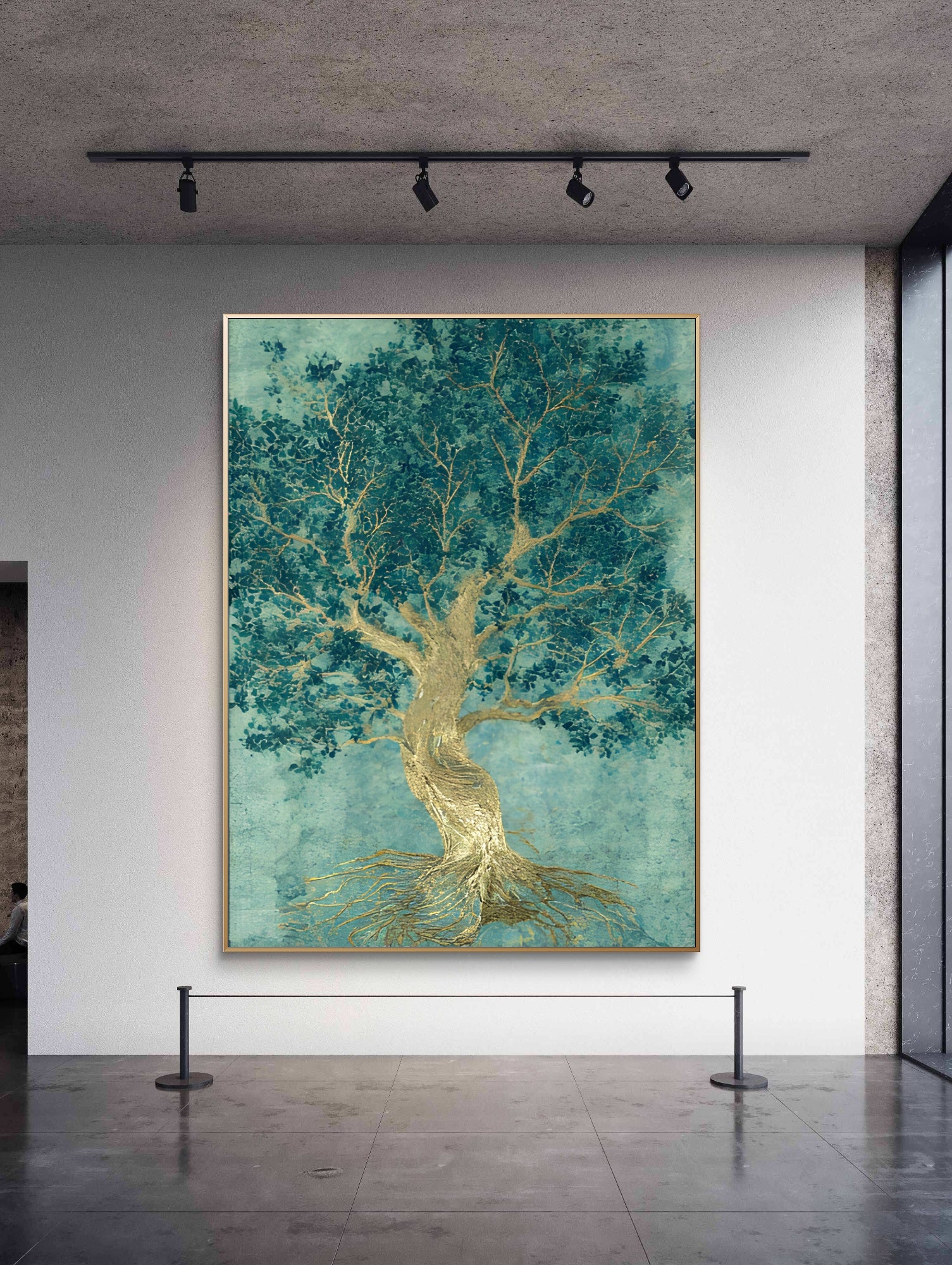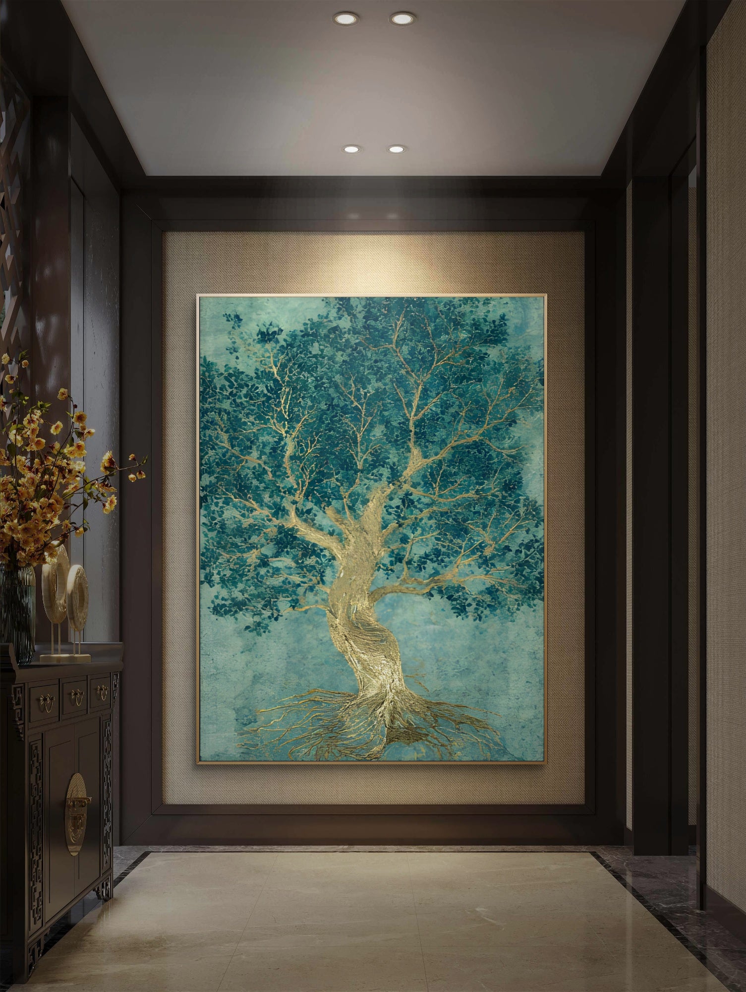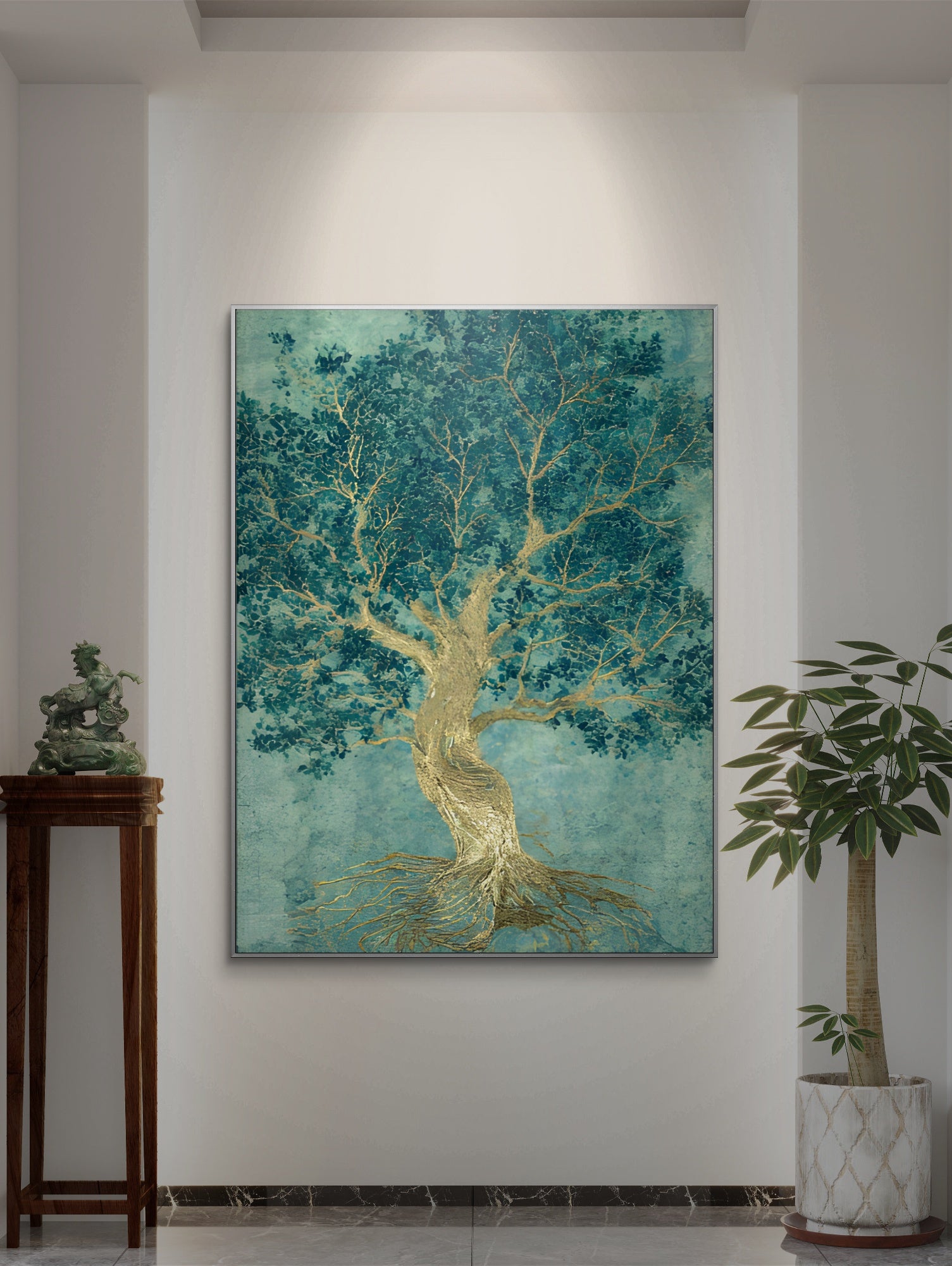 This stunning gold and teal masterpiece symbolizes growth, abundance, and timeless prosperity.