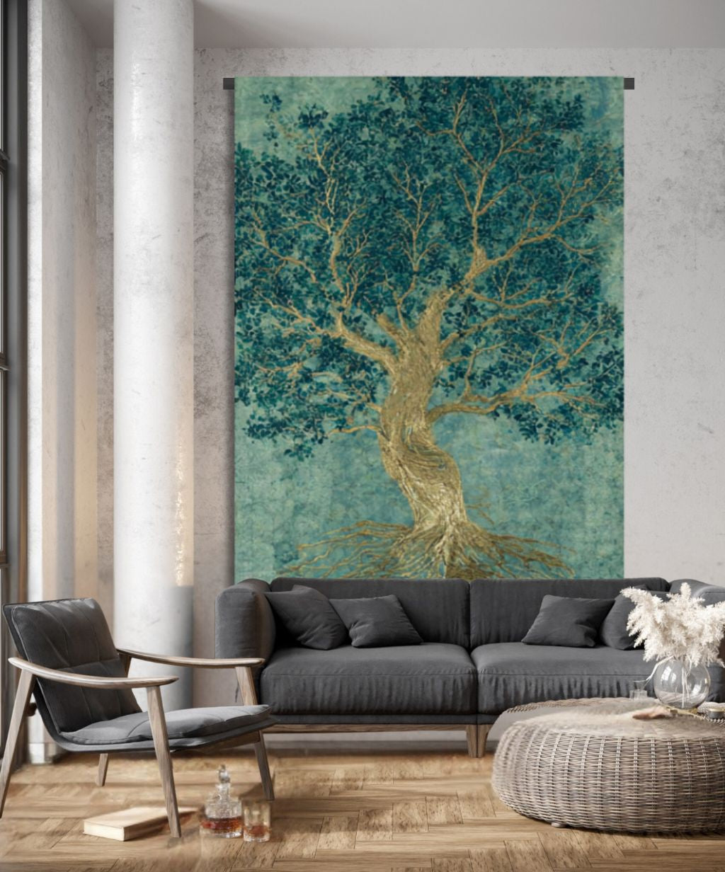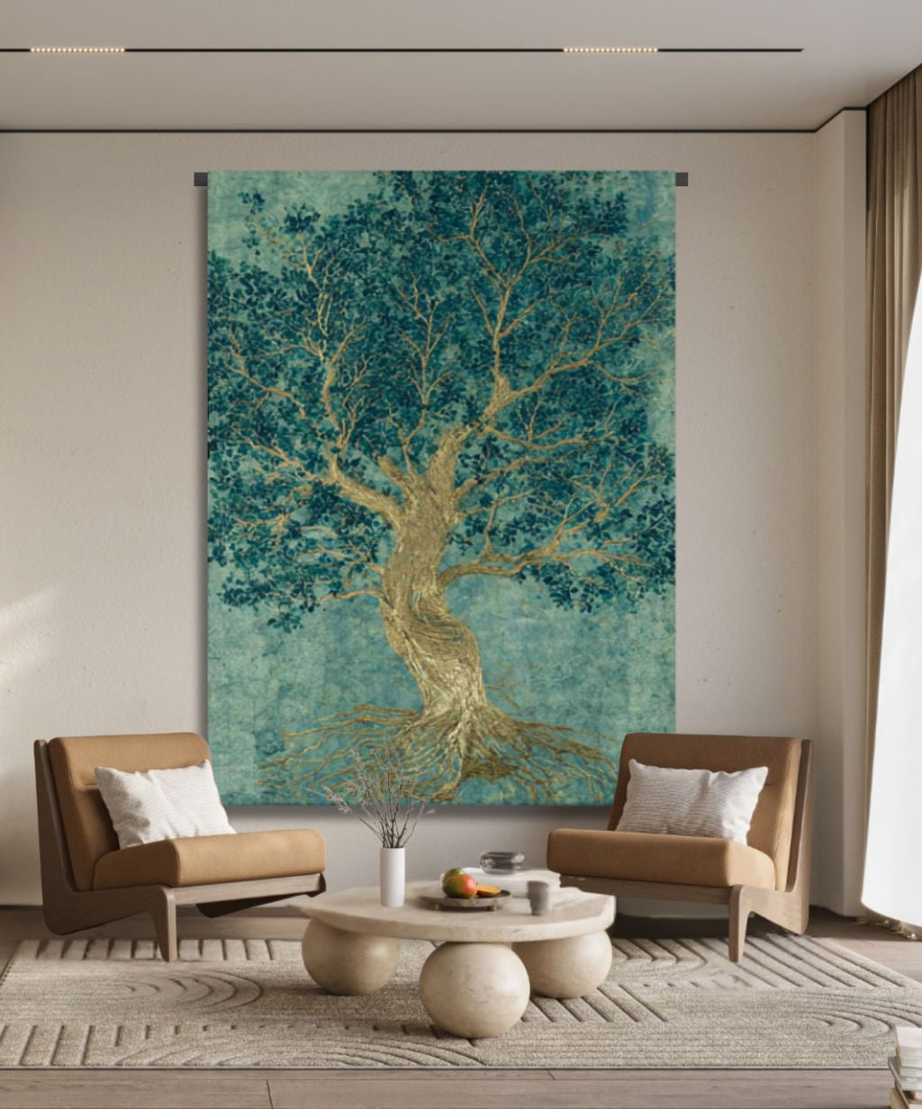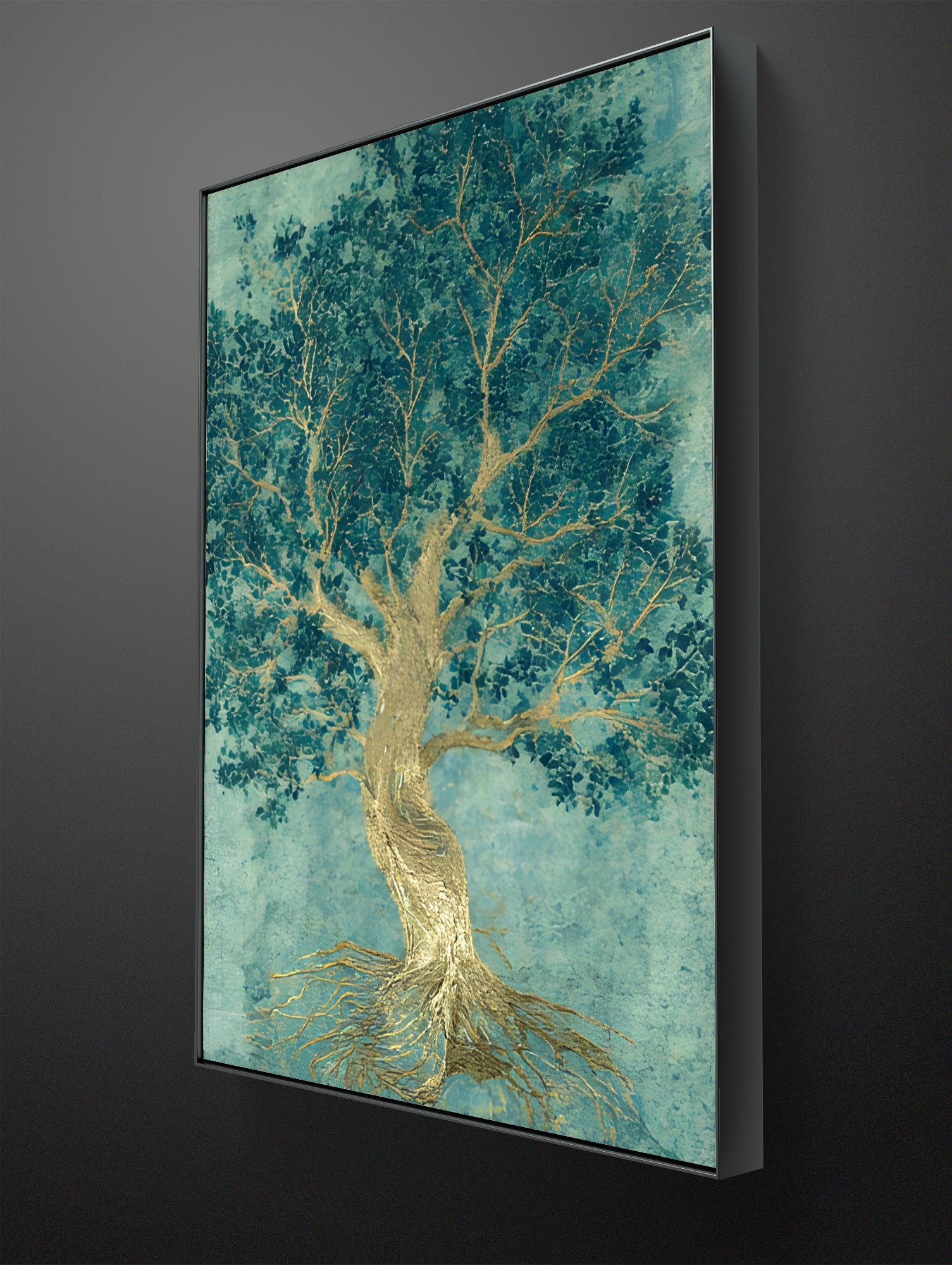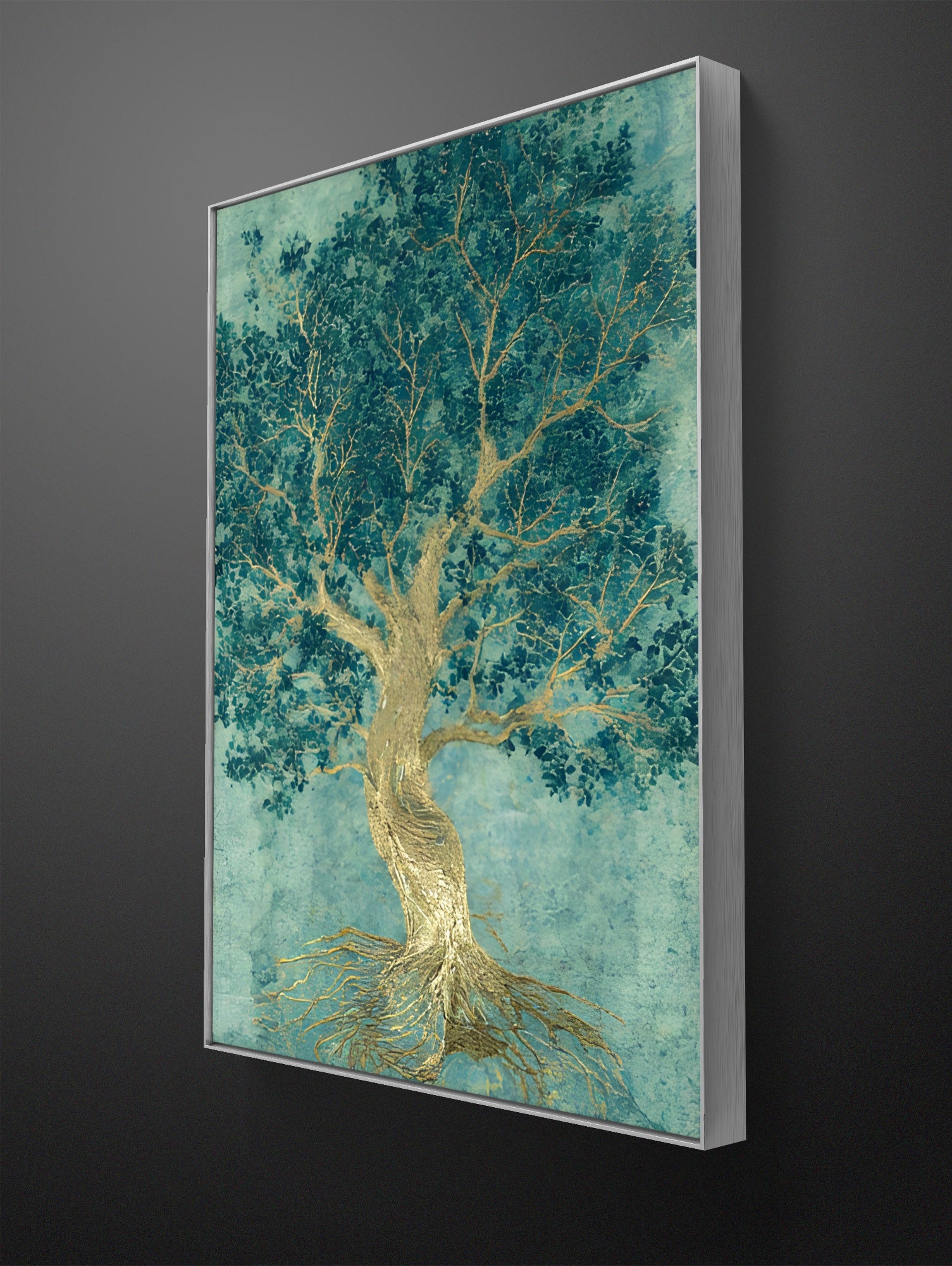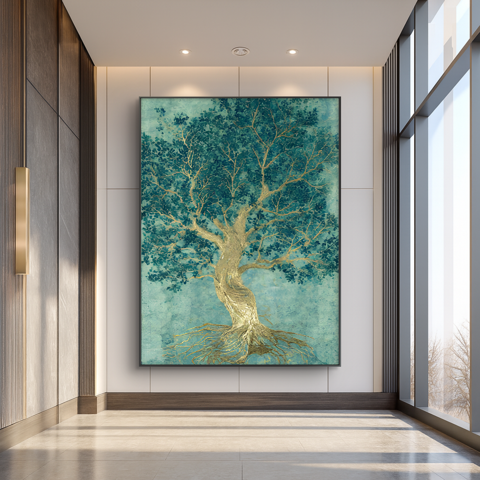 This stunning gold and teal masterpiece symbolizes growth, abundance, and timeless prosperity.
